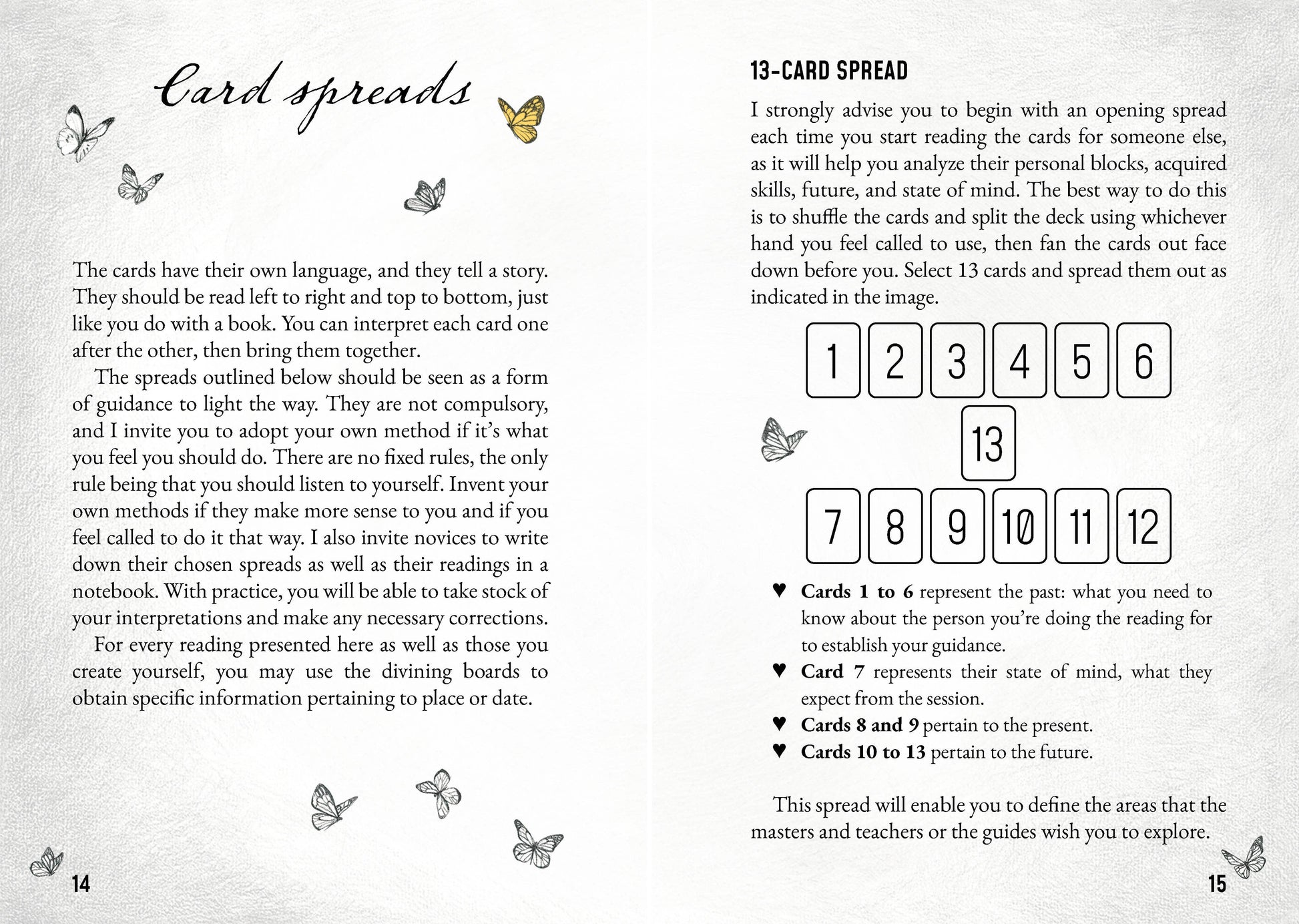 Included are 48 beautifully illustrated cards, a guidebook and two divining boards. These elements will provide you with keys to help you understand the nature of your personal blocks, obtain precise and dated information on your past lives, discover your life purpose and the potentialities you are called to develop, or even just undertake a more traditional divinatory reading.