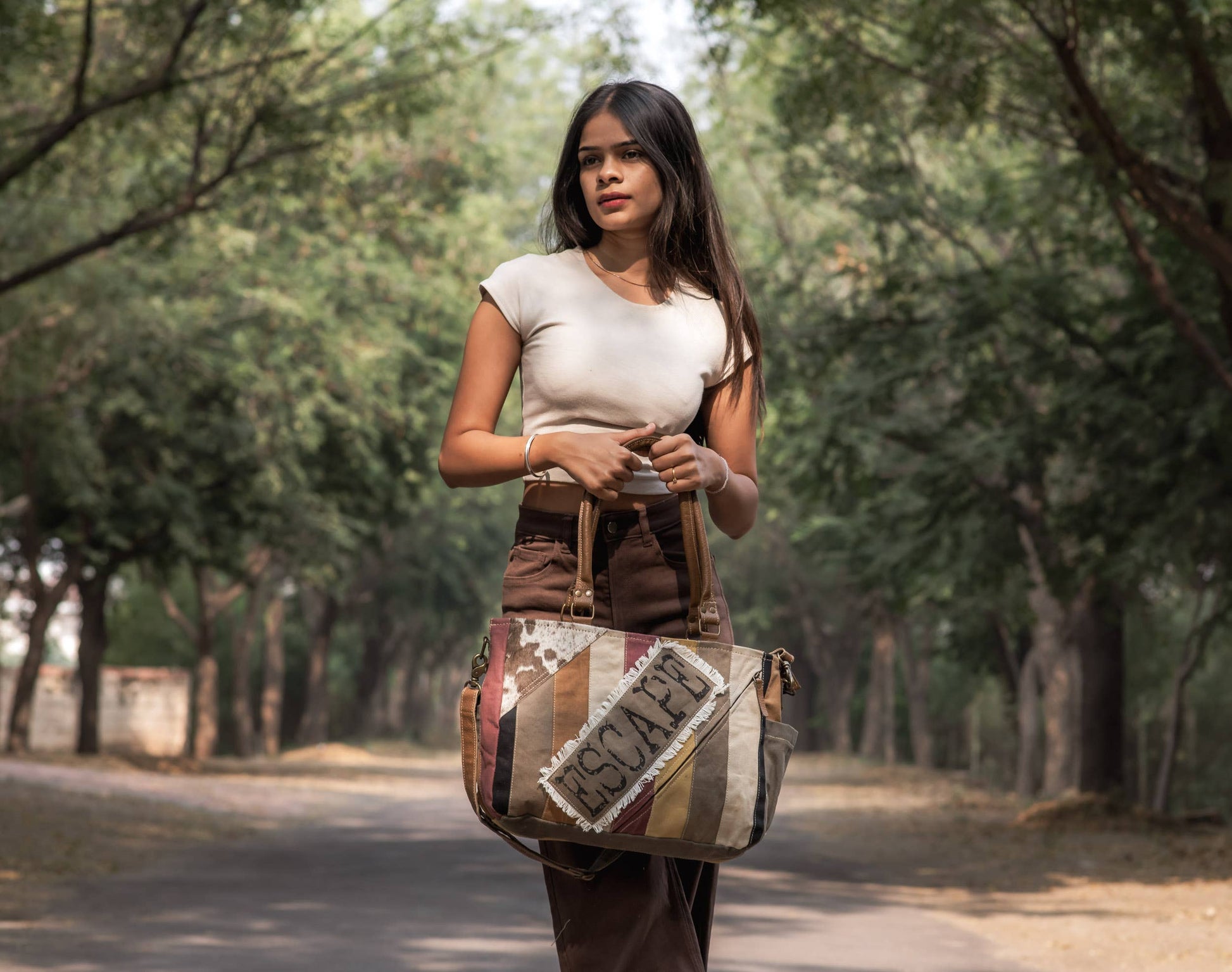 This handmade messenger bag featuring multiple canvas stripes, a chic front print, and a unique hairon patch on the side. With a spacious main zippered compartment, convenient side pocket, and a discreet back pocket is a fusion of style and functionality.