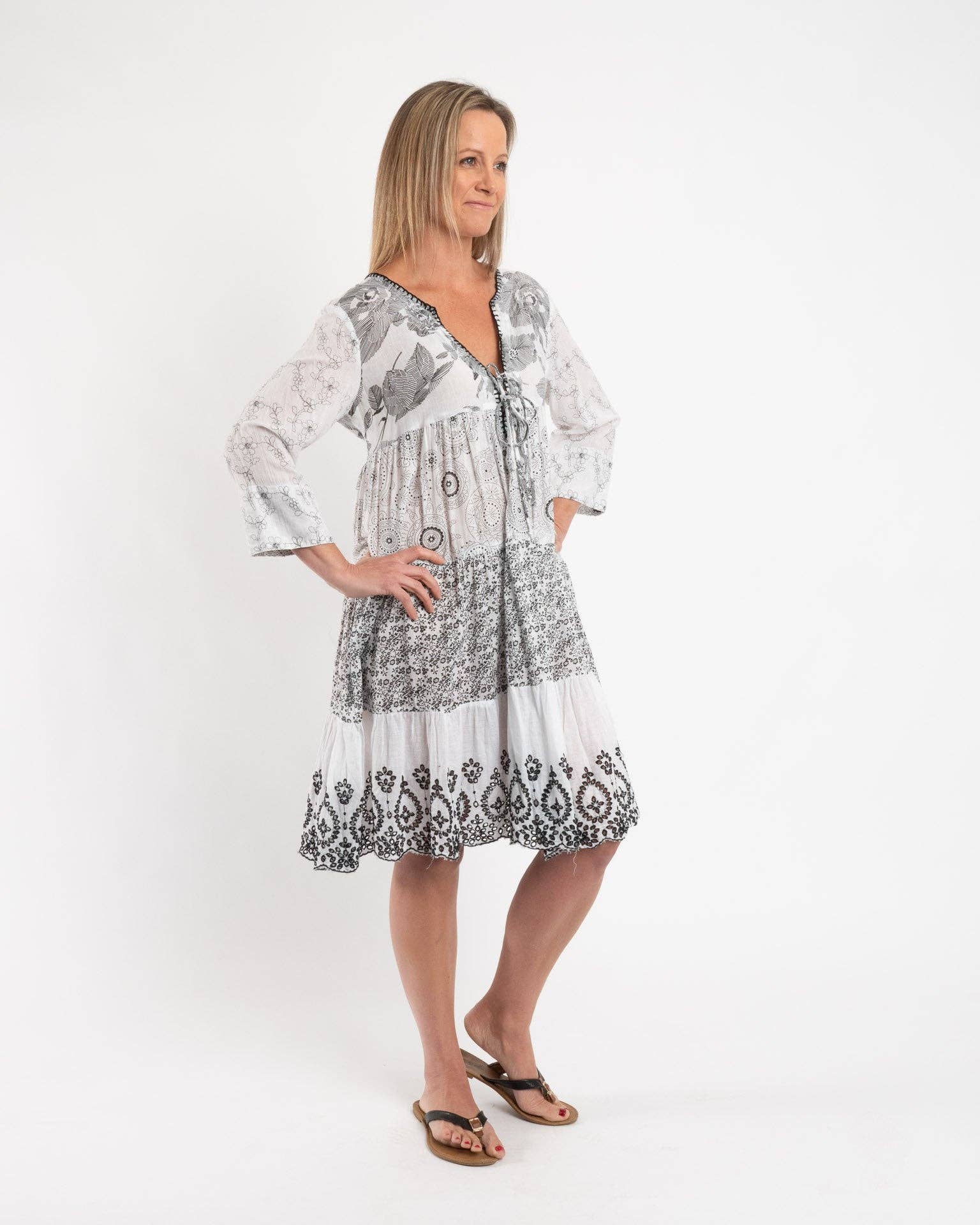 Mixed black and white print panels and Broderie Anglaise around the hem