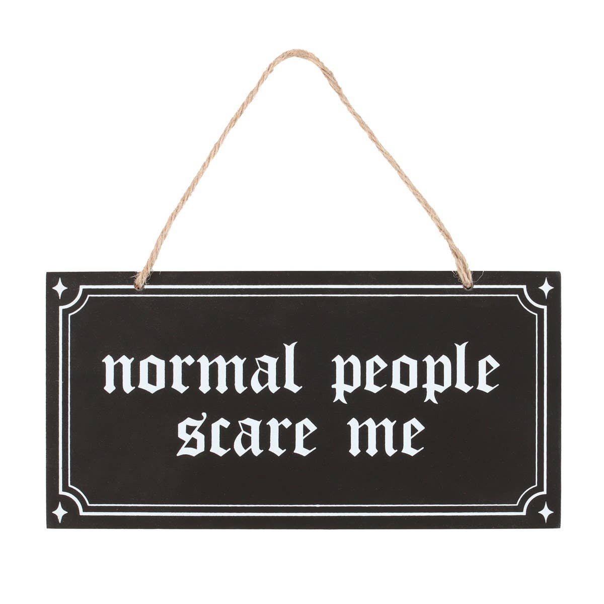 Embrace your quirky character and let your unique traits be known with this gothic style hanging sign which reads 'Normal People Scare Me'. H10cm x W20cm x D0.8cm