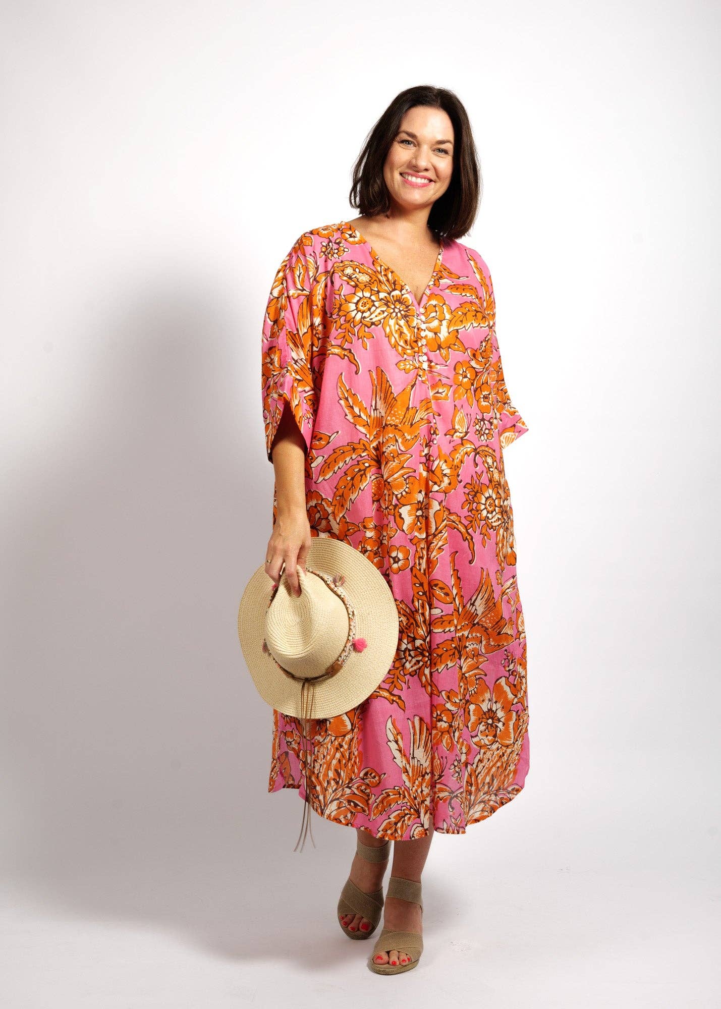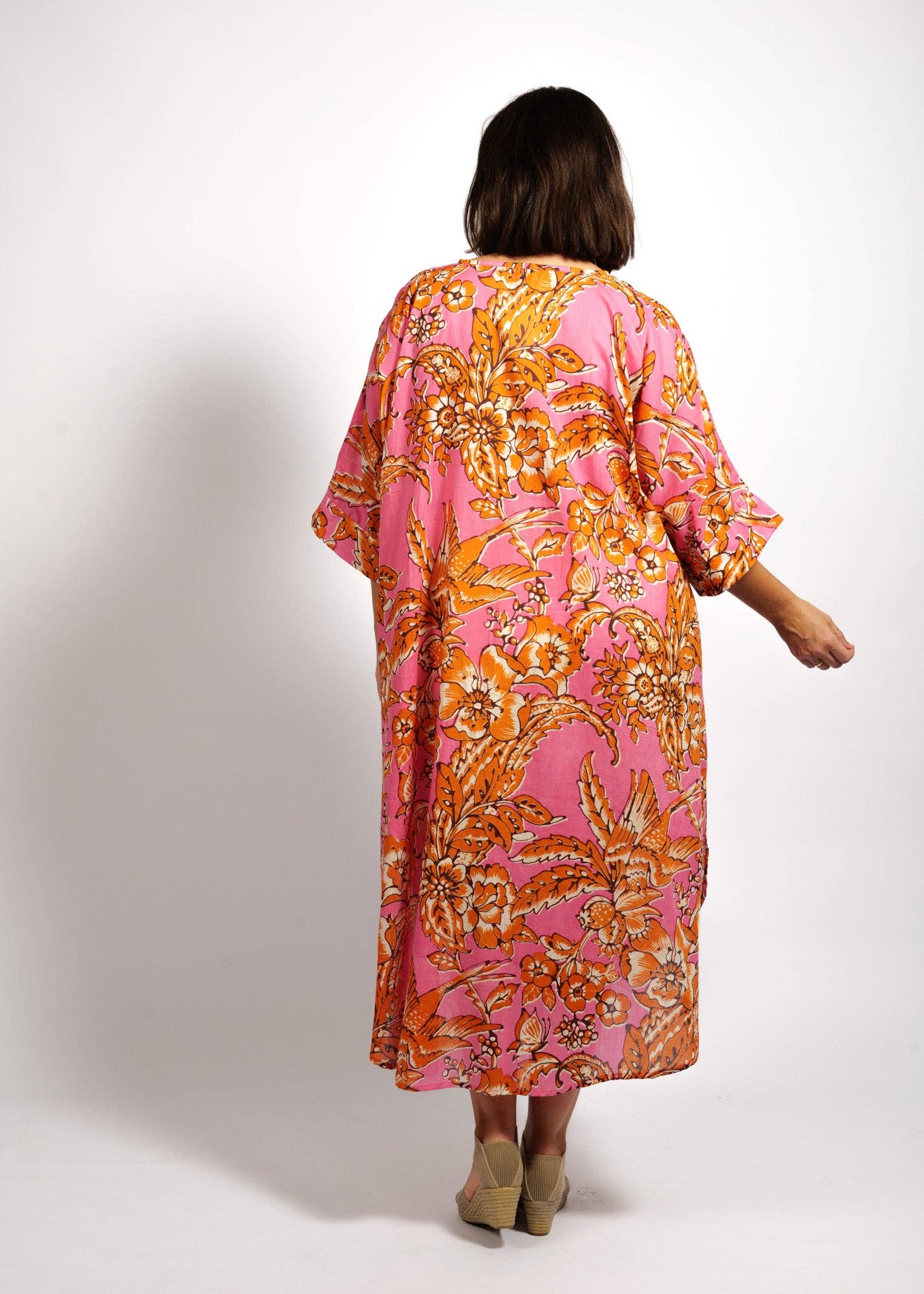 The Stella dress is designed for stylish, cool comfort. The V-neckline with roulette buttons and curved hemline with generous side slits create a graceful and feminine silhouette. The generous 3/4 sleeves with reversible cuffs add a touch of versatility. The maxi length offers a dramatic and elegant look. Crafted from pure cotton, it’s an easy to wear piece that will make you feel effortlessly chic.