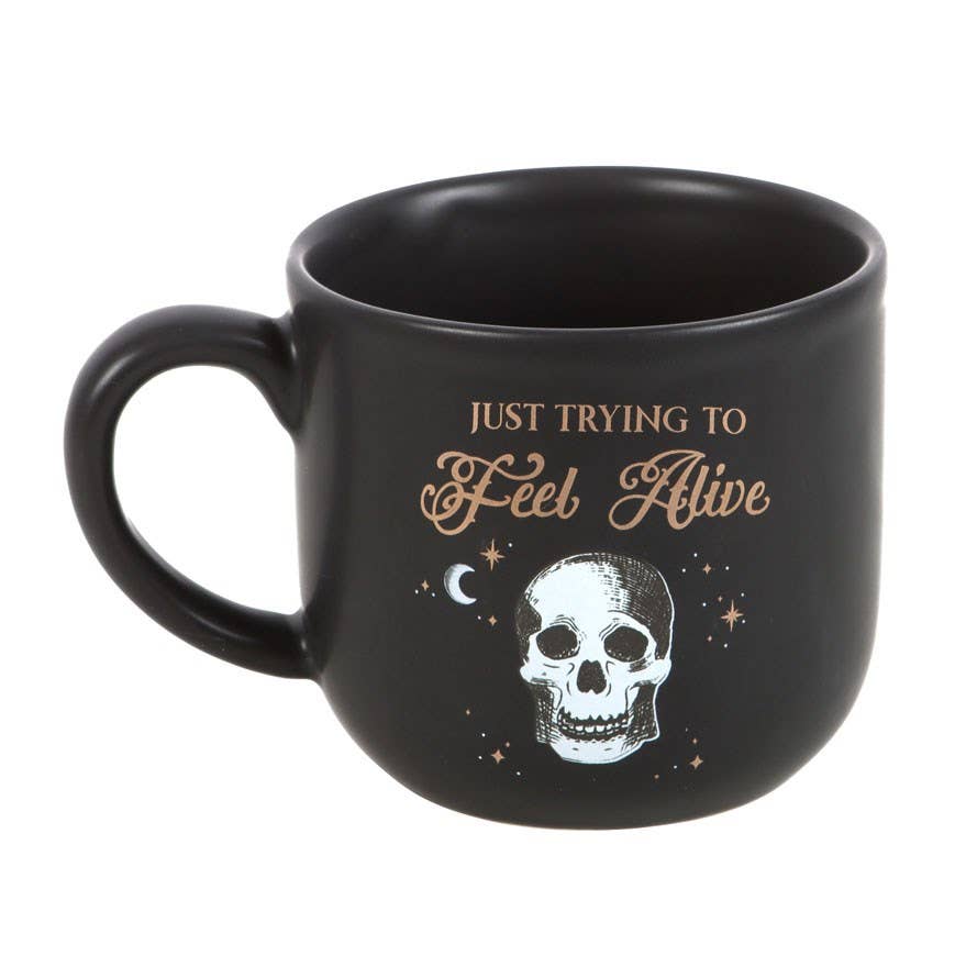 Get through the day with this relatable mug featuring the phrase 'Just Trying to Feel Alive'. This mug is a must-have for anyone who knows the struggle of starting their day before their first cup of coffee. Its playful black and gold skeleton design speaks to the soul of coffee enthusiasts and night owls alike. Handwash only. Not suitable for microwave use. 360ml. H8.6cm x W13cm x D9.3cm